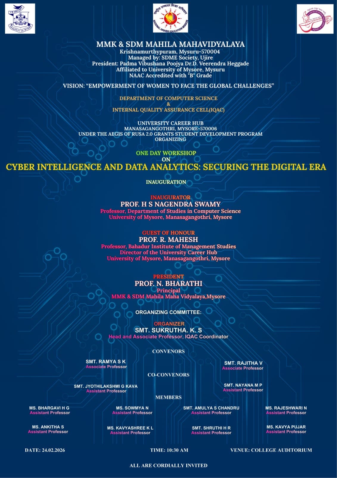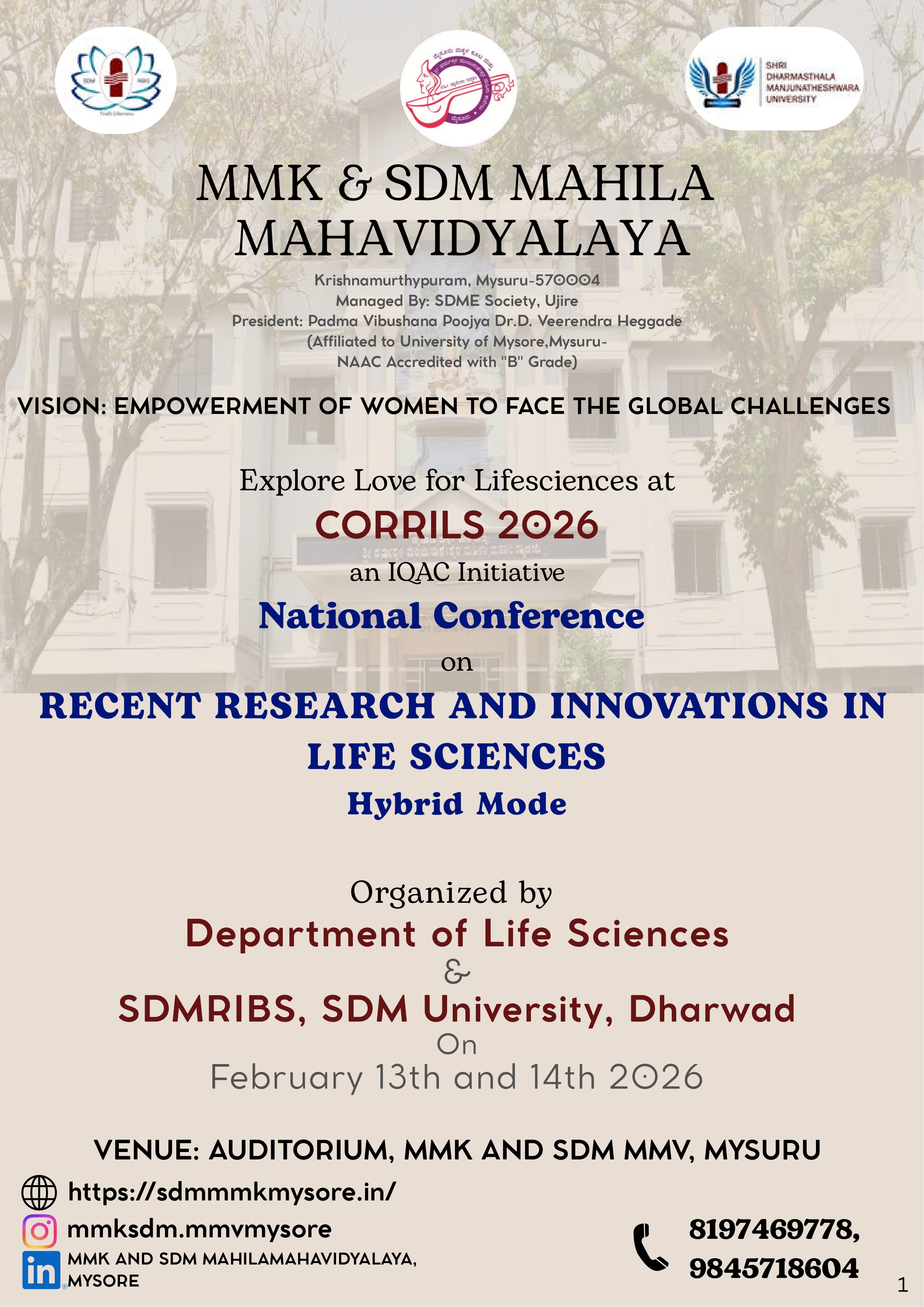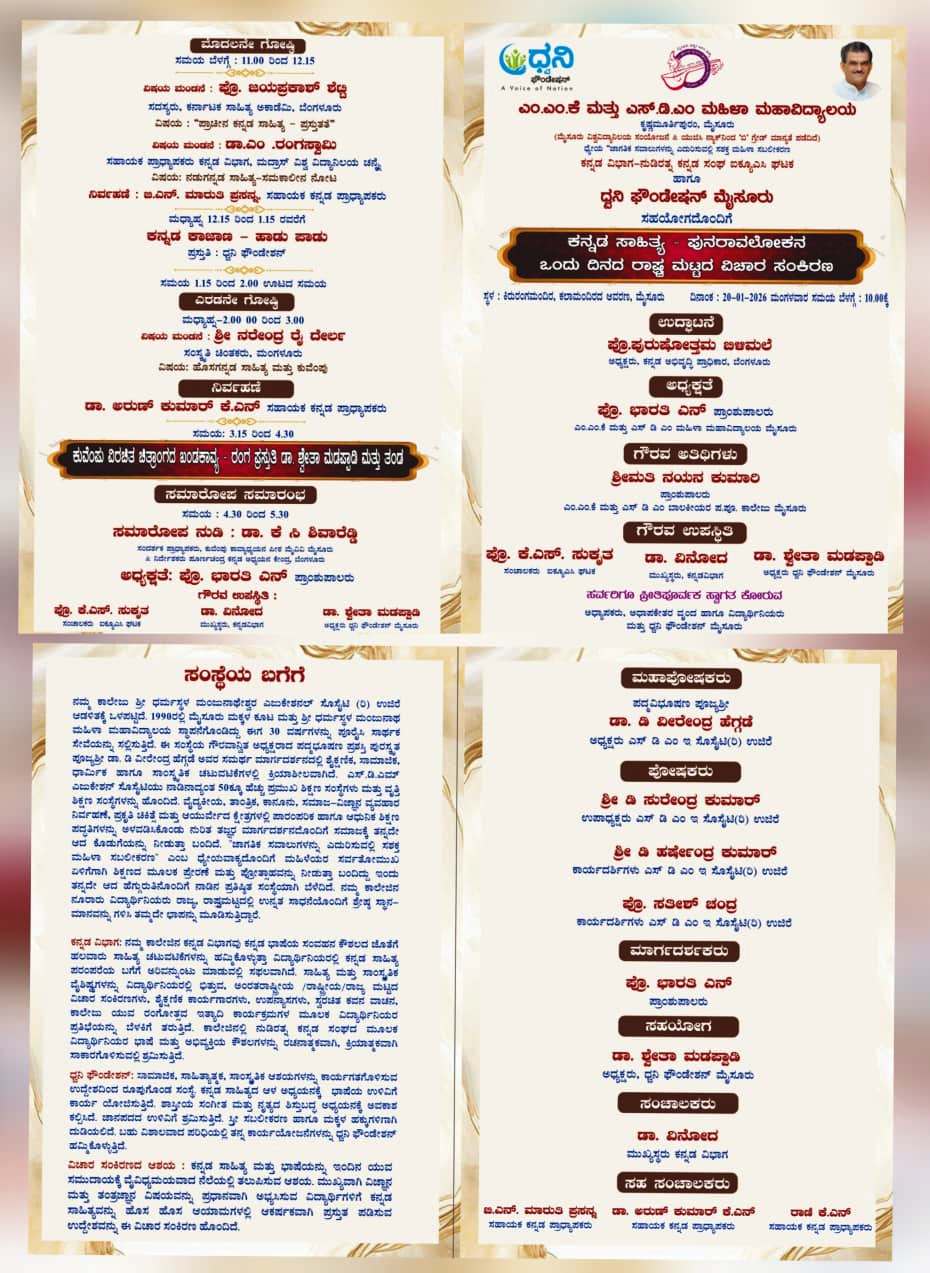 MMK And SDM Mahila Maha Vidyalaya, Mysore, is a pioneering college in the field of women’s education and empowerment. Established in the year 1990 by Mysore Makkala Koota(R) Mysore, the college was subsequently handed over to Shri Dharmasthala Manjunatheshwara Educational society (R), Ujire, Dakshina Kannada District, Karnataka, India. The name Shri Dharmasthala Manjunatheshwara casts a spiritual hallow all around. Also, our President Padma Vibhushan Poojya Dr.D.Veerendra Heggade’s name instantly brings in a stamp of integrity and quality. Read more